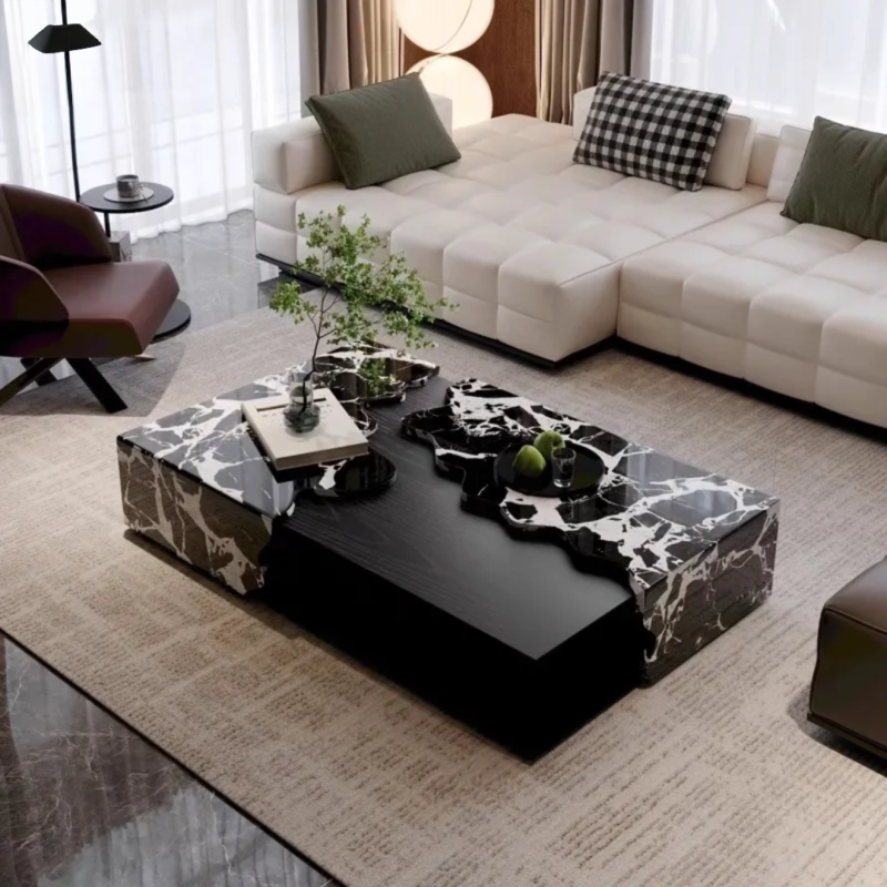 Iota Modern Rectangular Coffee Table | White & Black Marble Finish