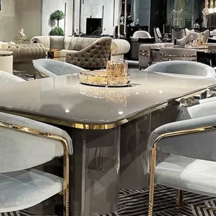 ₹218,600.00 Exclusive of taxes.Ramada Rectangle Sintered Stone Marble Stainless Steel Dining Table and 6 chairs set
