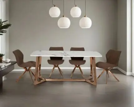 Original price was: ₹190,700.00.₹162,580.00Current price is: ₹162,580.00. Exclusive of taxes.Ray Dining Table Stainless Steel Golden Leg + Natural Marble Top Table with 6 chairs set
