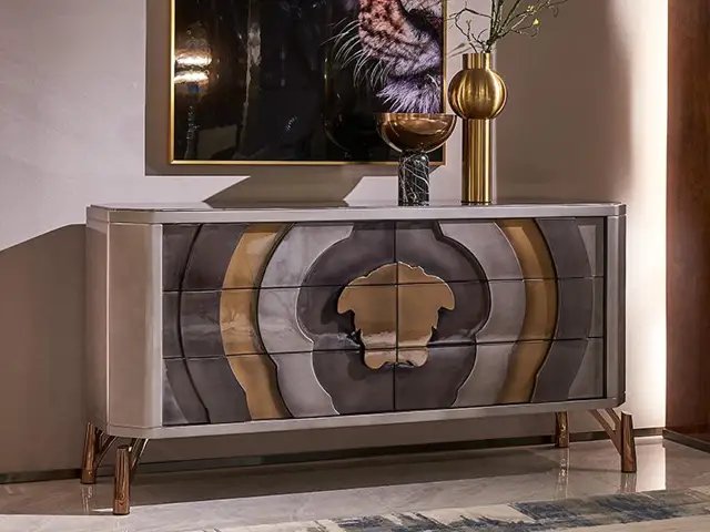 – Meticulously crafted from a blend of premium materials including PVD Coated Stainless Steel, Wooden Board, Resin Top, and Glass.