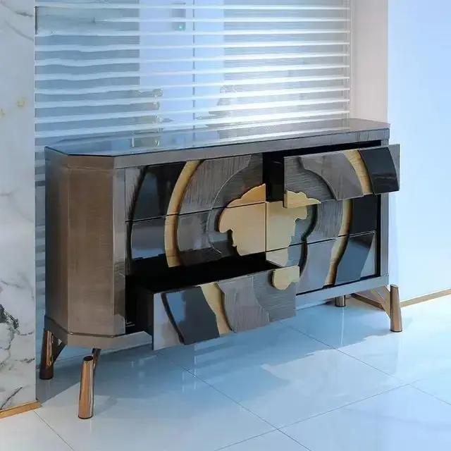 – **Material:** PVD Coated Stainless Steel, Wooden Board, Resin Top, Glass