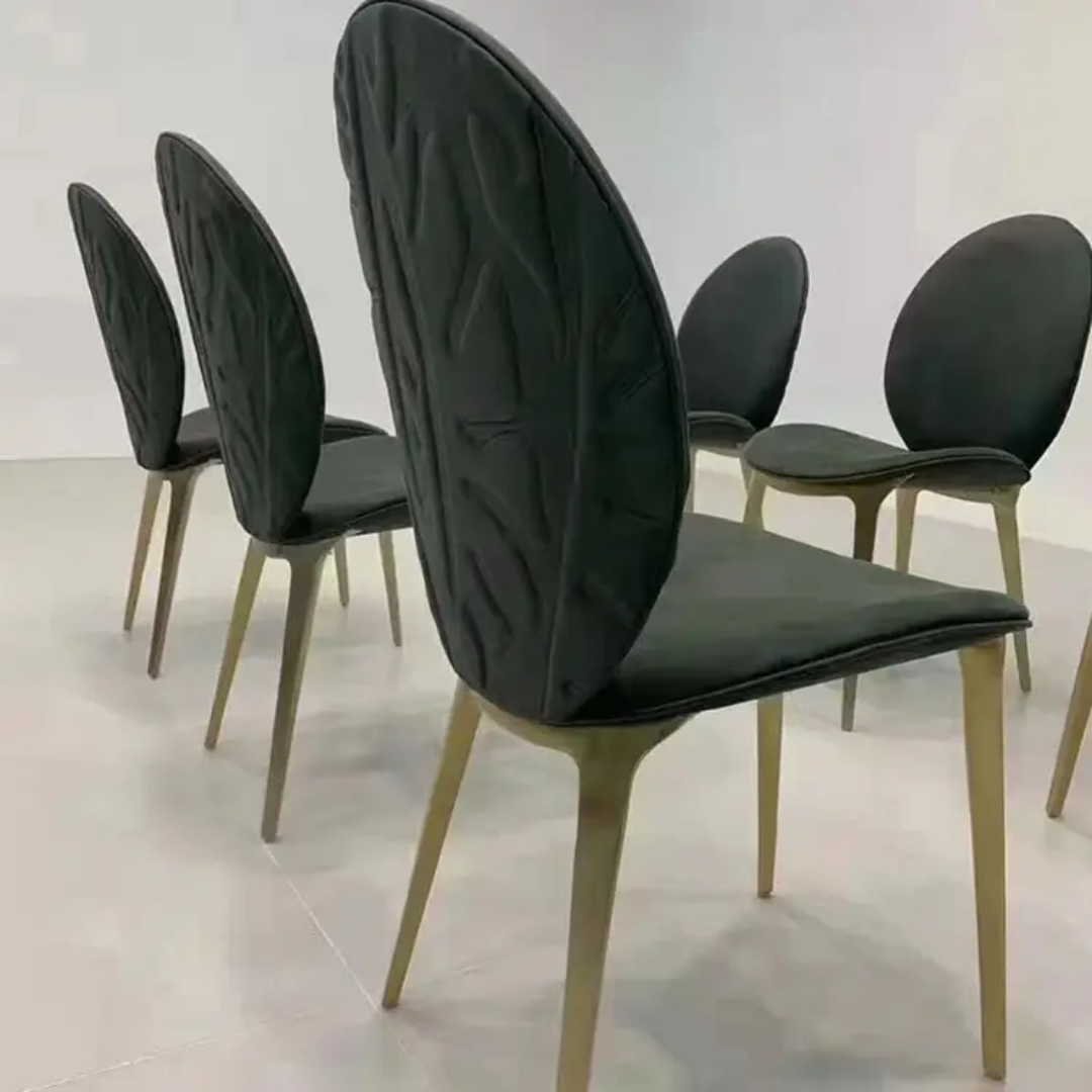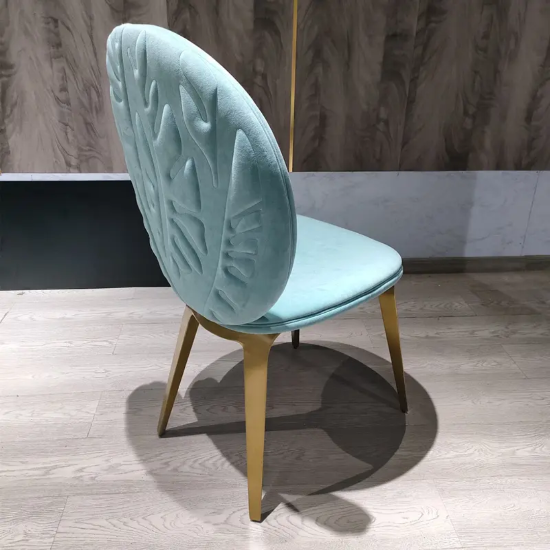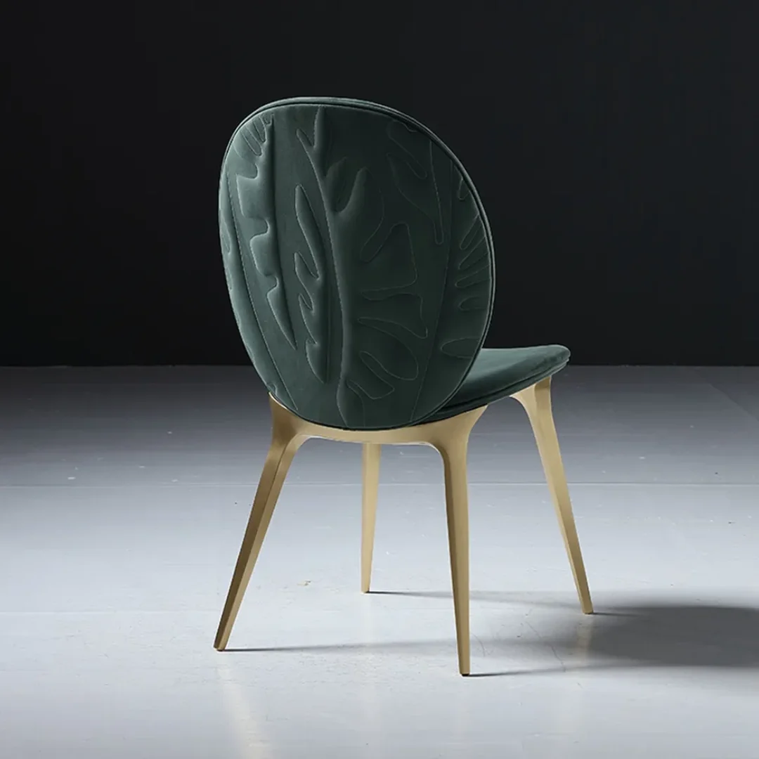 This dining chair distinguishes itself through surface: velvet with embossed pattern, creating dimensional interest that shifts with light and viewing angle. The embossing is not applied decoration but woven into the fabric itself—subtle depth that rewards closer attention.
