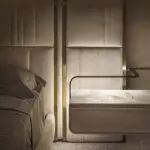 An aesthetic storage bed that is modern and exclusive and showcases minimalist style. The Biwel Bed features a plush upholstered headboard and sides. It features channel tufting, a wooden base, and clean lines. This bed is an opulent addition to a contemporary design room.