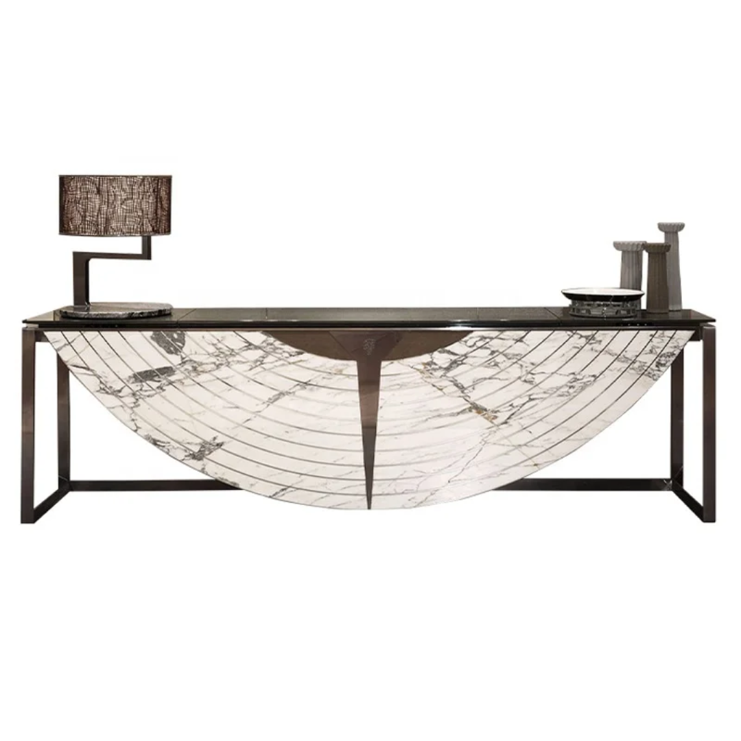 The console speaks in understatement. There is no ornamentation, no applied decoration—only form, material, and the relationship between them. The design reveals itself slowly: the way stone meets metal, the shadow line beneath the top, the proportion of mass to void.