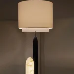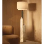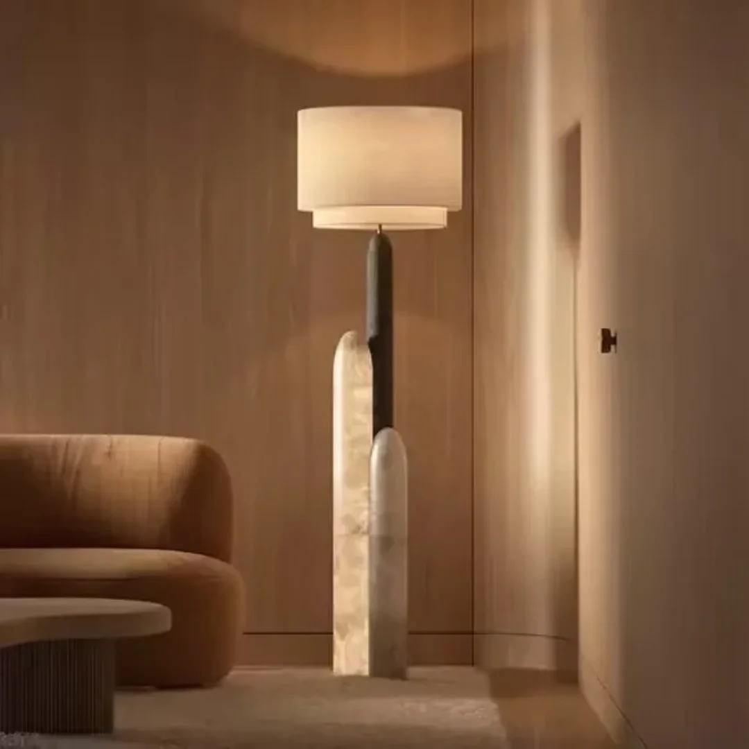 This floor lamp transcends functional lighting to become architectural statement. Natural alabaster and aged bronze meet at dramatic angles—translucent stone glowing from within, dark metal providing vertical counterpoint. The composition balances raw material honesty with refined execution.