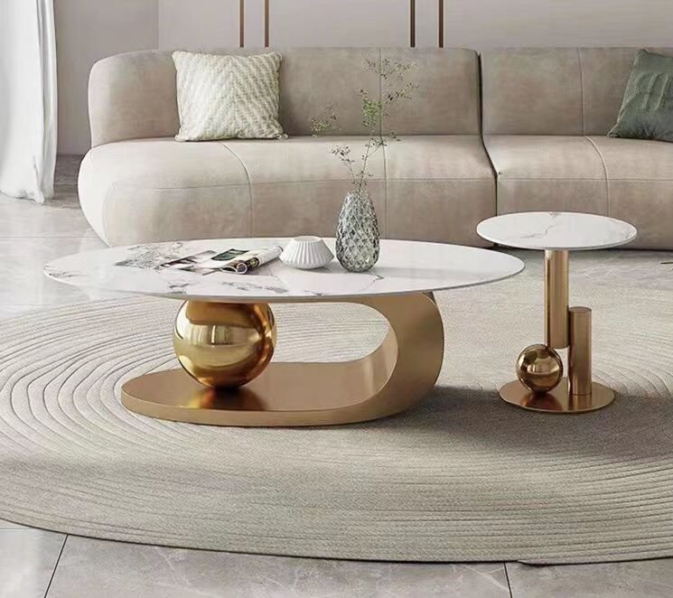 SIMPLE DESIGN: Set of 2 Eclipse oval coffee table and round Side Tables – Fits almost everywhere and be adjusted into vary positions | Stainless steel bottom frame & Faux marble surface, and it’s easy to move around and at home