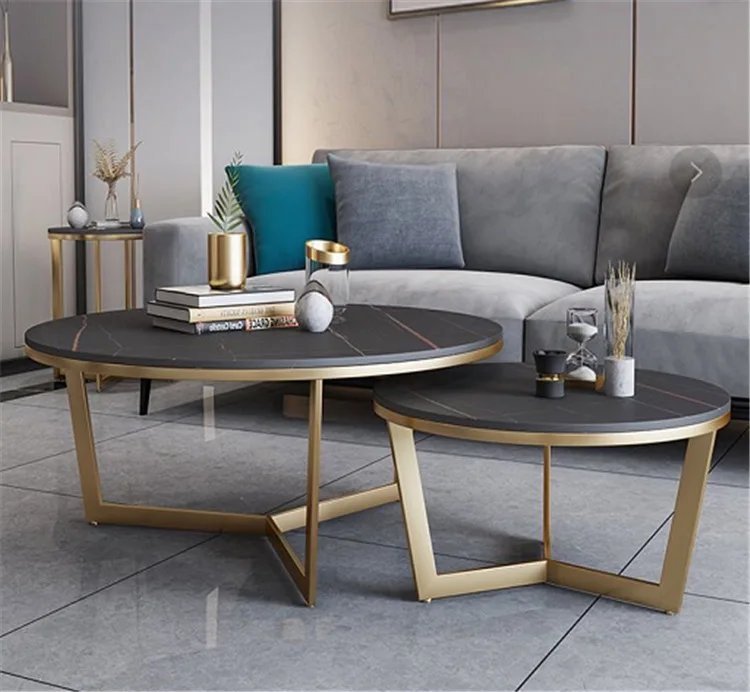 Introducing the “Elegance Duo,” a stunning pair of nesting coffee tables that epitomize luxury and contemporary design. Crafted with precision, each table features a lustrous faux marble round countertop that seamlessly complements any sophisticated decor. The tables are supported by a unique triangular tripod-shaped base, expertly finished in a dazzling gold PVD coating that adds a touch of glamour and stability.