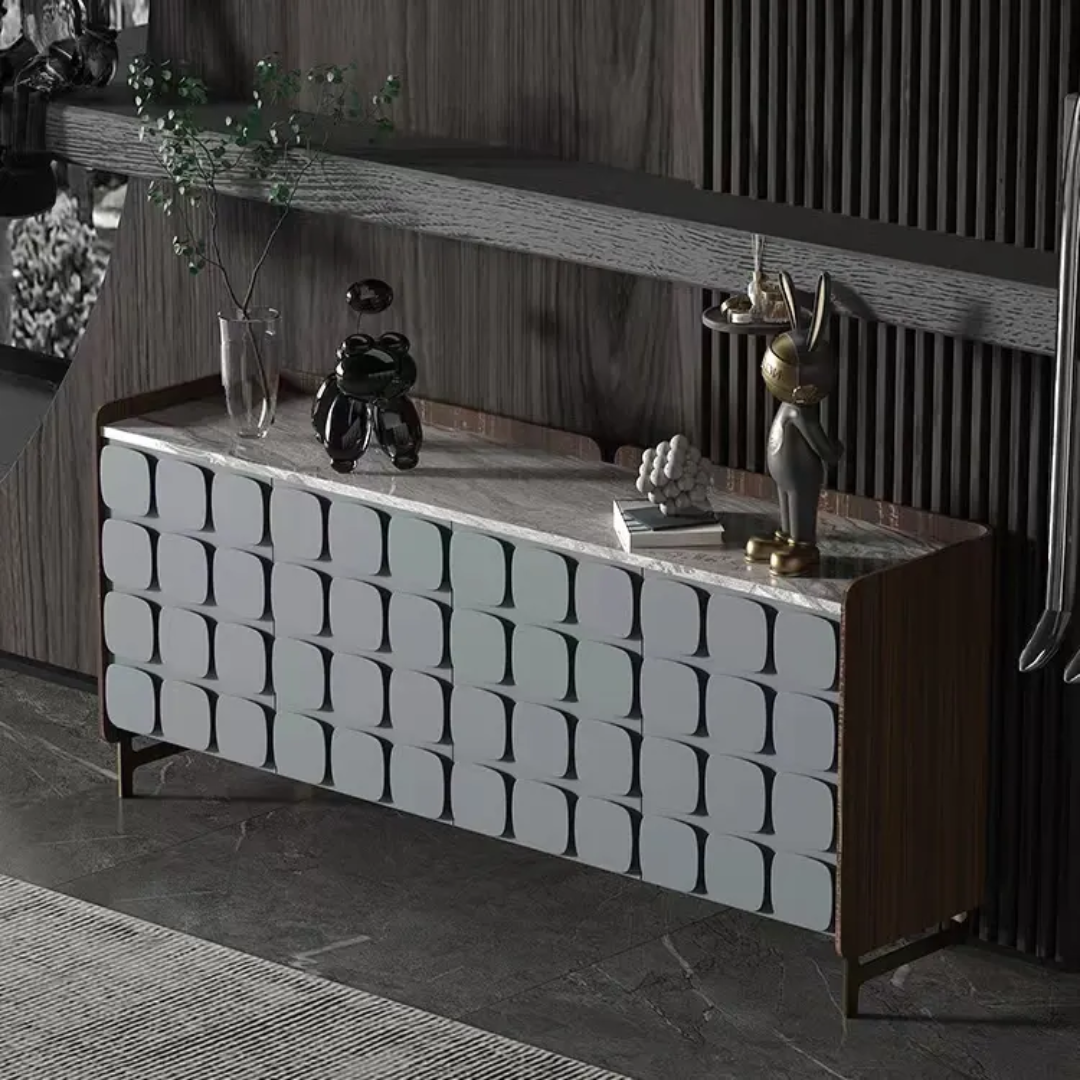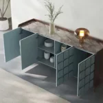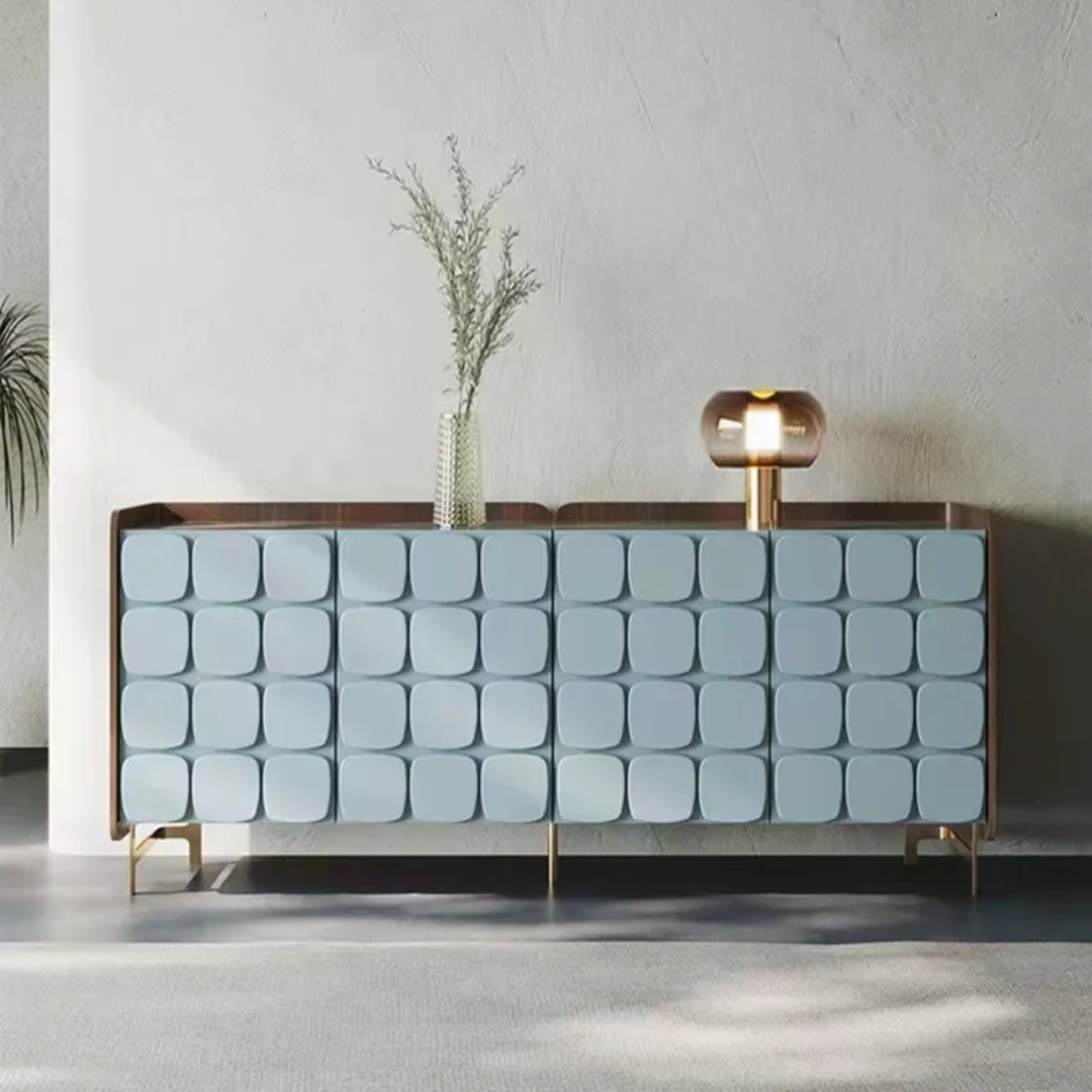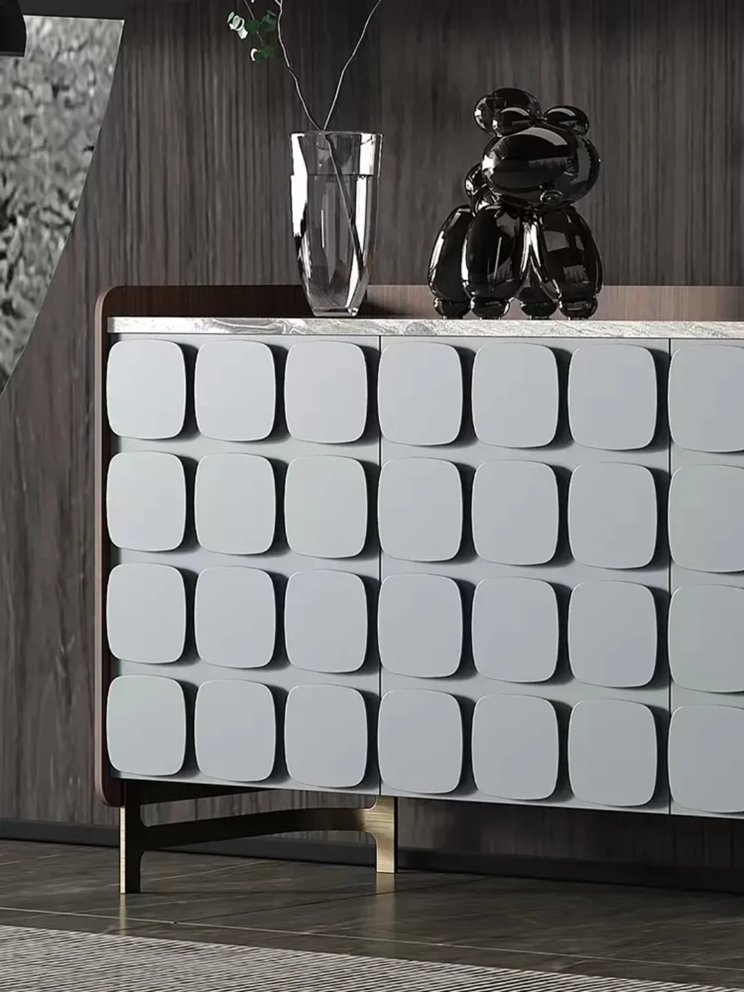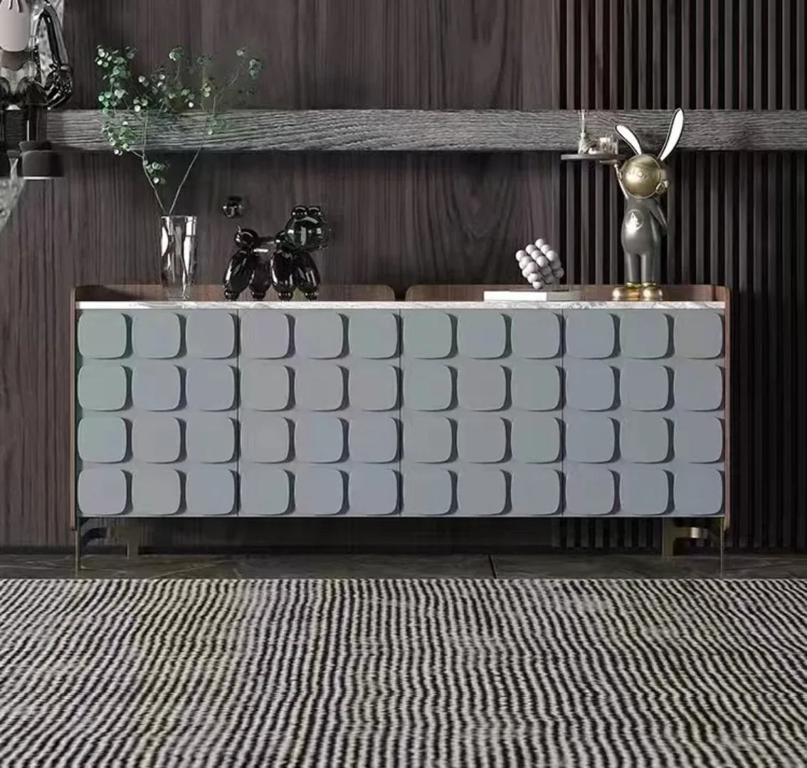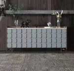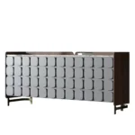 If you want a bit of luxury in your living room, choose the Minimus console. It is worth composing for it equally sublime and stylish accessories. The base is golden in color, while the feathers can be in various shades of white or beige. Placing such an accessory on the console table will make the whole look even more elegant. The glamor candlesticks on a round plinth are an equally tasteful decoration. In this case, the golden candlesticks will be the best solution, which will beautifully correspond with the shimmering grey color of the chest cabinet base.