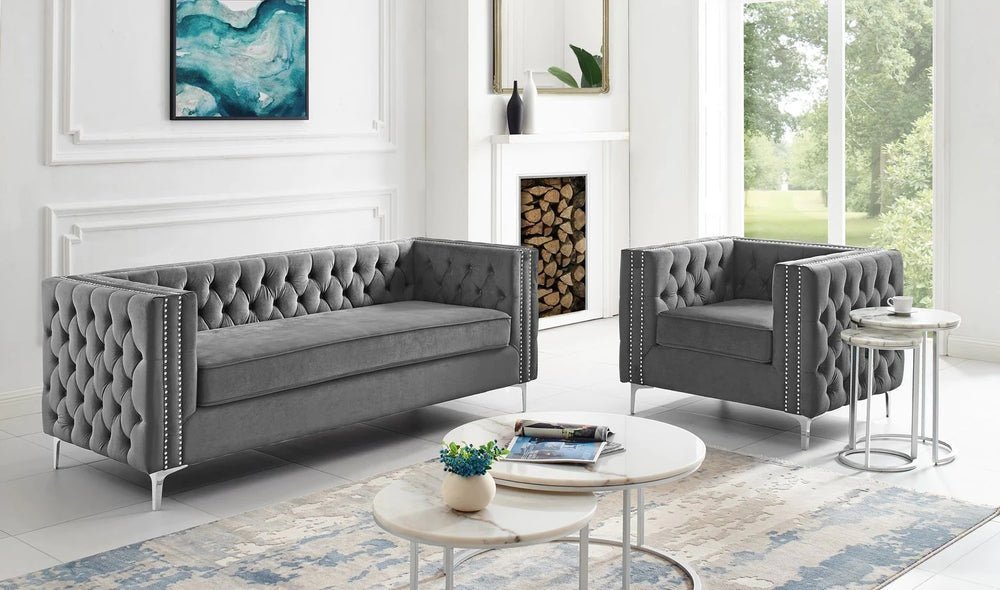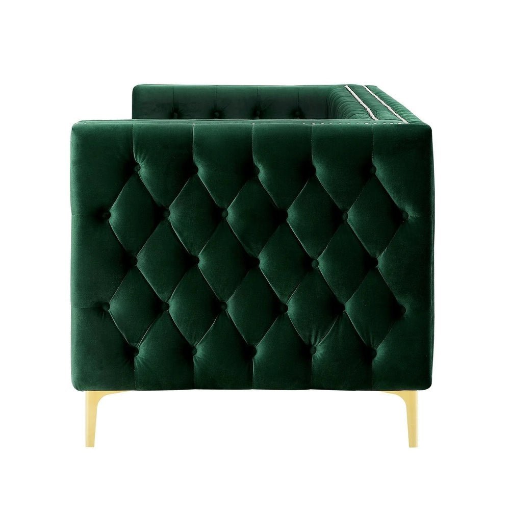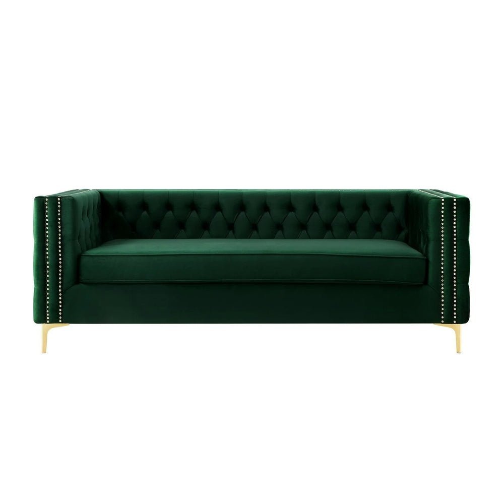 Crafted with meticulous attention to detail, this sofa features sumptuous, richly hued velvet upholstery, adorned with eye-catching button tufting and highlighted by contrasting, gleaming nailhead trim. The clean, square arms and high-density foam padding ensure a seating experience that’s not only ultra-comfortable but also supports your posture and relaxation needs.