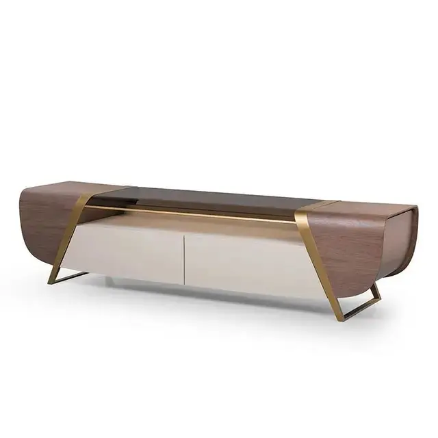 Elevate your home’s aesthetic with this sleek and modern TV unit, designed to infuse your living area with a touch of contemporary elegance. This premium TV stand boasts a luxurious marble top and a striking geometric base, offering a unique blend of style and functionality. The dual-drawer configuration provides ample storage for organizing essentials, while the expansive surface area is perfect for showcasing decorative items, electronics, and more. Constructed from high-quality engineered wood and reinforced with durable stainless steel in a chic gold finish, this entertainment center promises long-lasting stability and support.