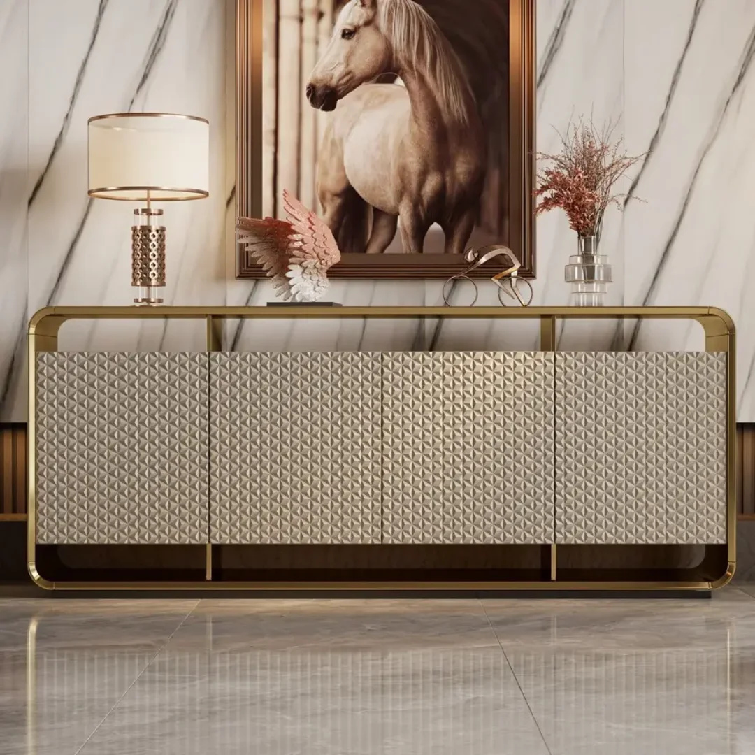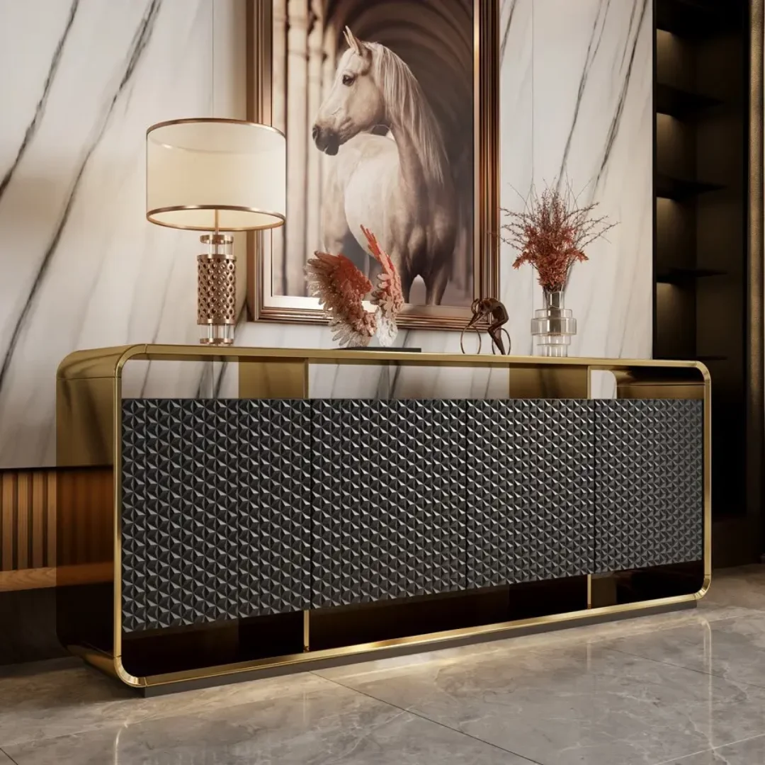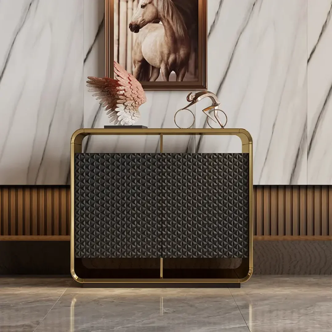 Add a new sight to your living space with this contemporary and stylish sideboard. This high-end piece features a glossy Brown/Gold rectangular top and geometric base to create an entertaining taste and good-looking appearance. Four partition design offers a stylish storage area for stowing the little things on hand while the spacious tabletop provides a large space for displaying your flowerpot, hardware, and other items. Crafted from engineered wood and durable stainless steel in the gold finish, it will ensure a highly sturdy support for years. Both fashionable and functional, this entryway table must be a nice addition to your house!