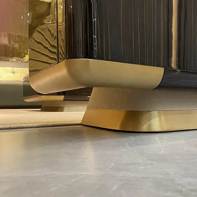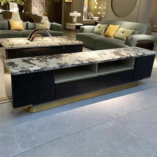 Transform your entertainment space with this ultra-modern TV unit, a masterpiece of contemporary design that elevates any living area. Boasting a sleek marble top and an eye-catching geometric base, this TV stand is not just a piece of furniture, but a statement of style and sophistication. The unit’s luxurious marble surface is perfectly complemented by a dazzling gold-finished stainless steel frame, offering unmatched stability and support for your entertainment setup.