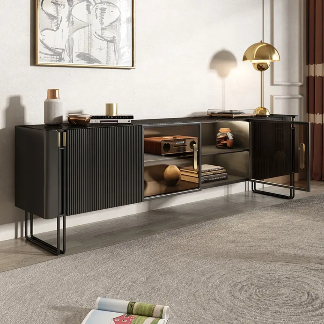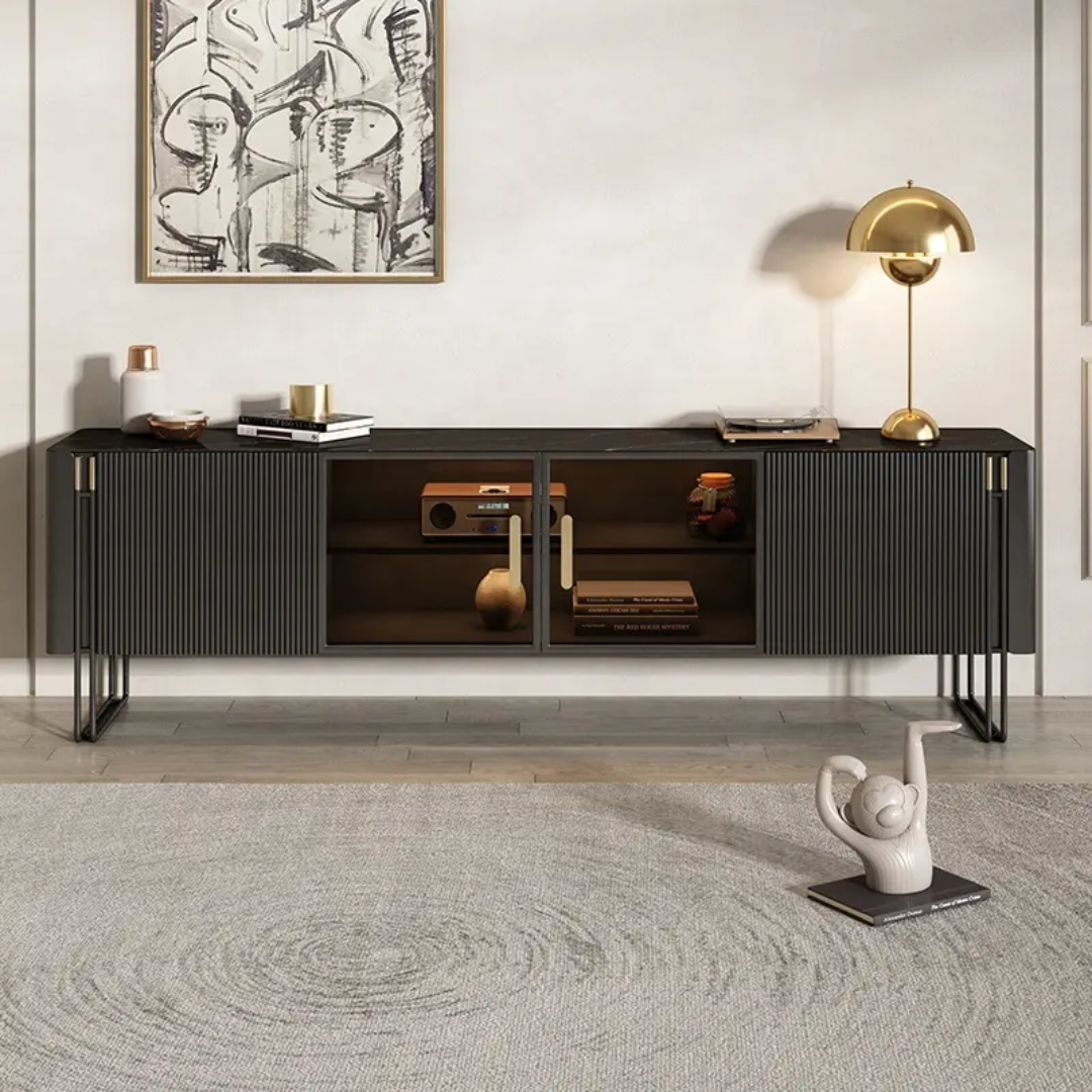 Grand TV Unit | Modern TV Cabinet Marble Slate Carbon Steel Base