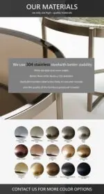– **Material:** The chair is built with durable gold chrome stainless steel, ensuring both longevity and elegance. The bending plate structure adds a unique and contemporary touch, while the faux leather upholstery, available in sophisticated mustard and tan hues, provides a soft and luxurious feel. High-density sponge cushioning offers ultimate comfort for prolonged seating.