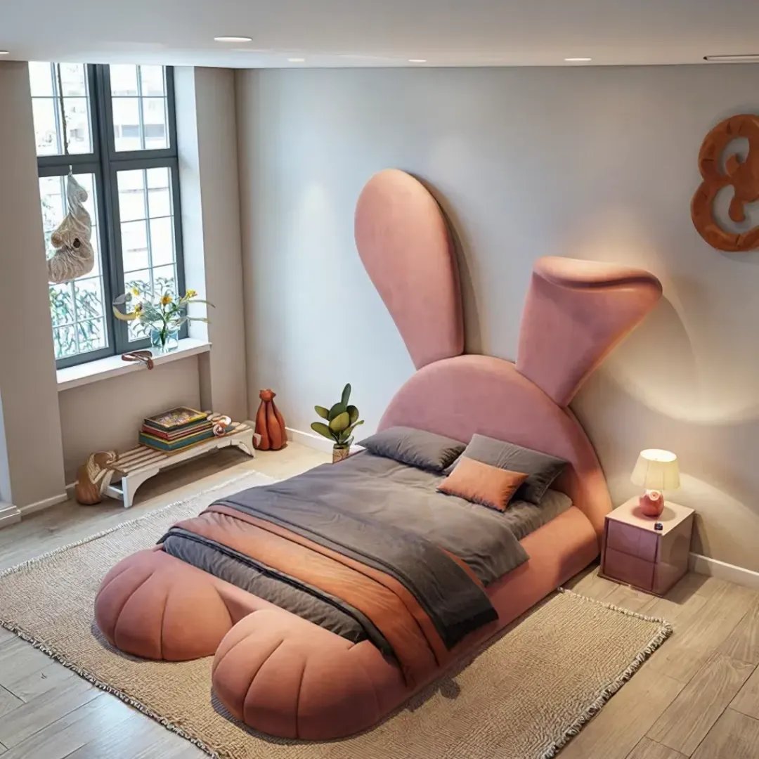 The show-stopping feature is the extraordinary bunny-shaped headboard with two tall, gracefully curved ears that tower above the bed, creating an instant focal point and transforming the bedroom into a storybook scene. This isn’t subtle children’s furniture—it’s bold, playful, and utterly captivating.