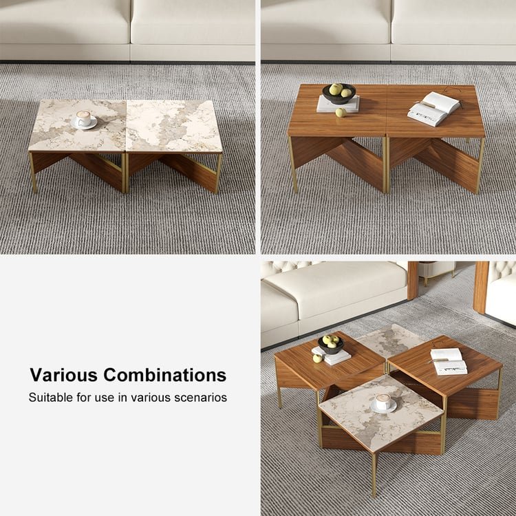 This one-of-a-kind coffee table blends natural textures with bold modern geometry. Featuring two square walnut veneer tops, two sleek Pandora sintered stone slabs, and sixteen brushed stainless steel legs, it adds depth, dimension, and luxury to any living room setup. Whether you’re entertaining guests or enjoying quiet moments, this table becomes the centerpiece of your space.