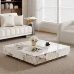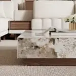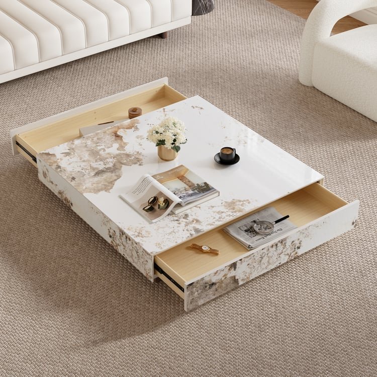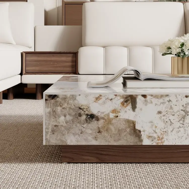 Luxury coffee table, sintered stone table, modern coffee table, marble-inspired table, square coffee table, heat-resistant table, scratch-resistant coffee table, living room centerpiece, minimalist furniture, functional coffee table with drawers.