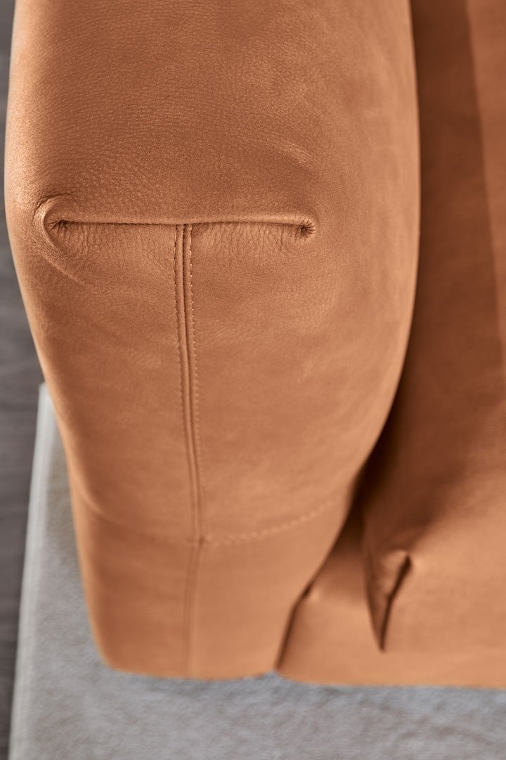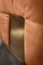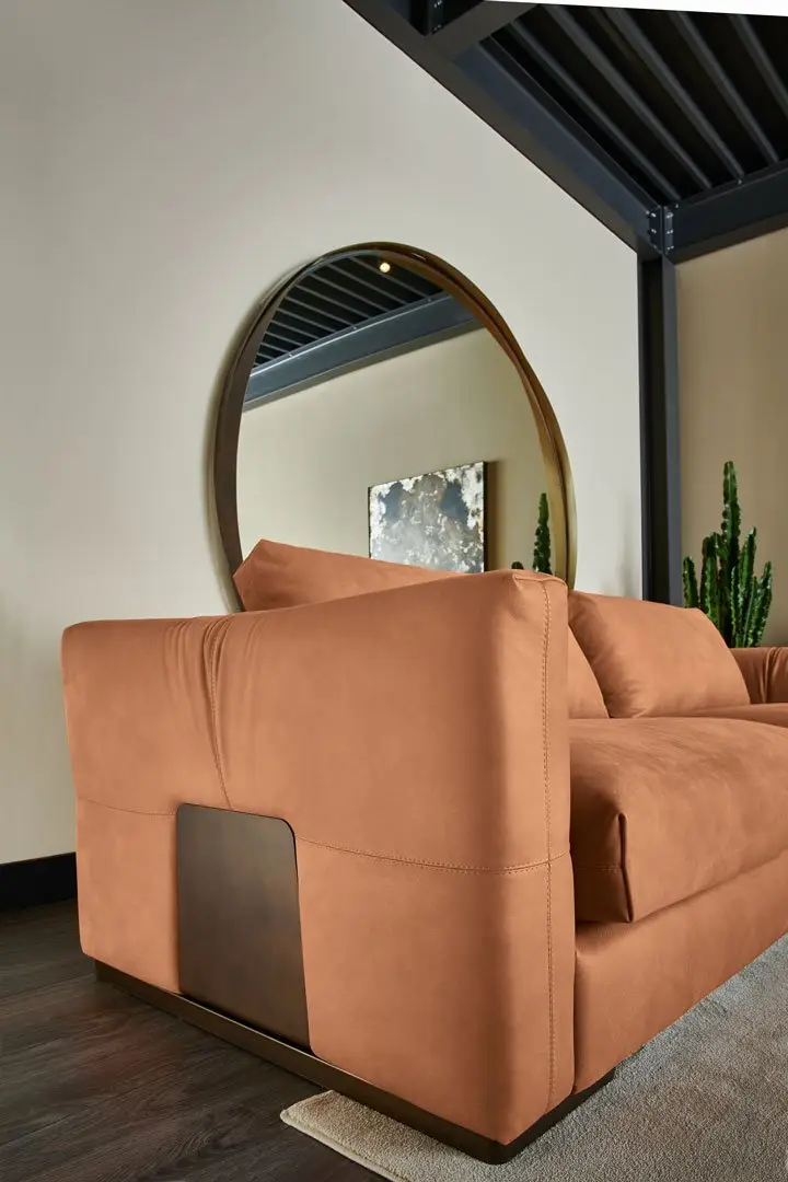 What sets the Minosotta apart is its distinctive bronzed metal plate that literally embraces the sofa:
