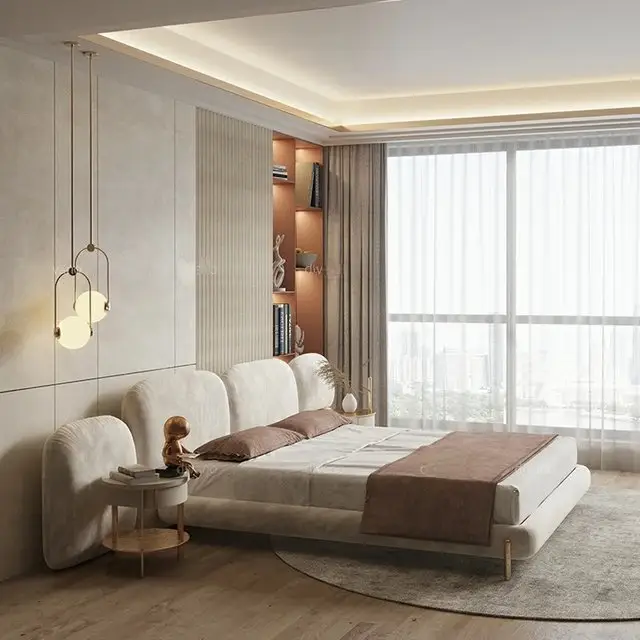 Home Furniture BEDROOM Beds Miraj Beige Contemporary Minimalist style Velvet Upholstered King Size Bed Low Profile