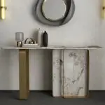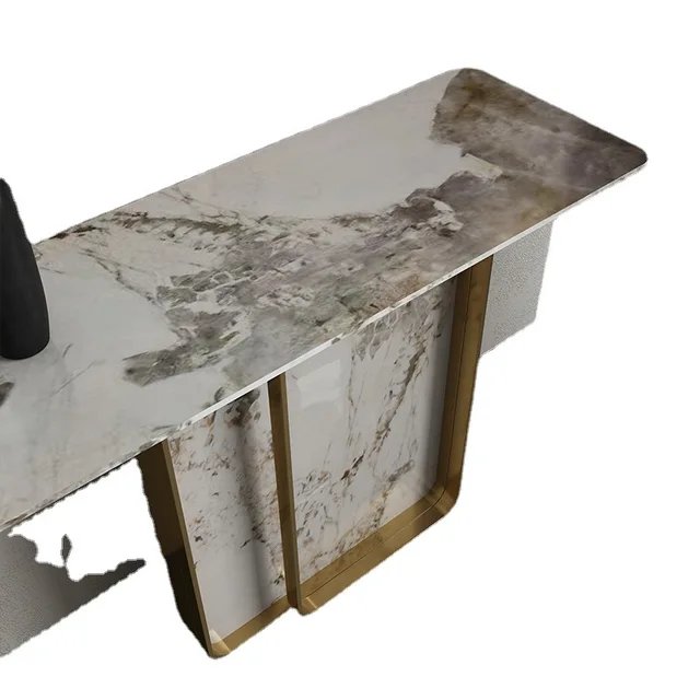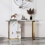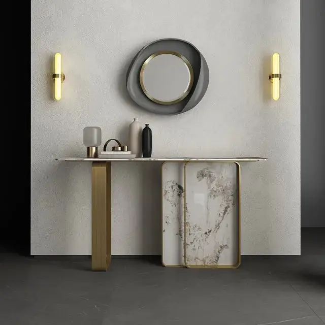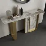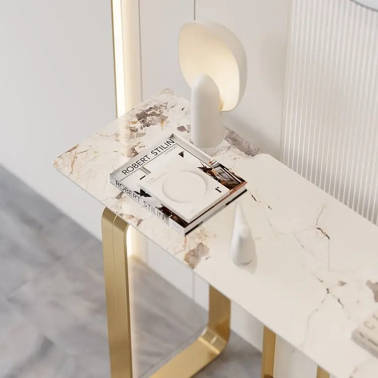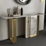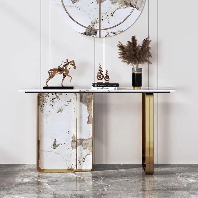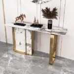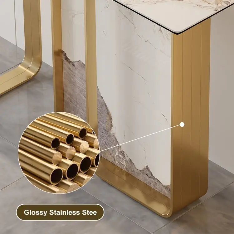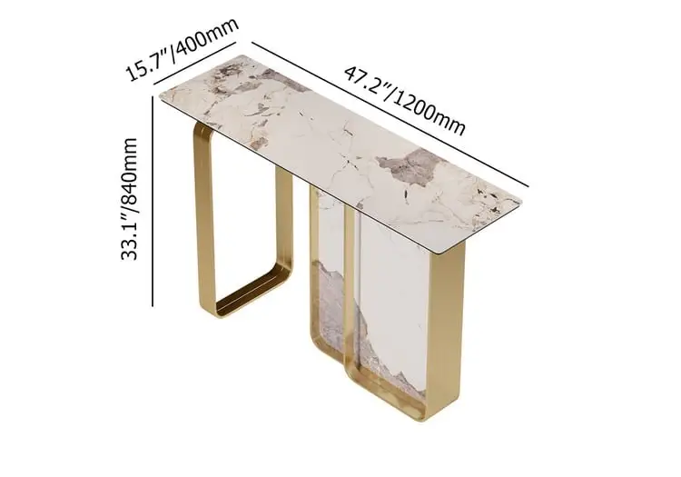 Elevate your home décor with the “Sleek Gold Elegance,” a contemporary console table that seamlessly combines luxury with modern style. Designed to impress, this table features a sophisticated gold finish and a robust rectangular shape that makes it a standout piece in any living space. The top material boasts a high-quality blend of stainless steel and stone, ensuring durability and a sleek, polished look.