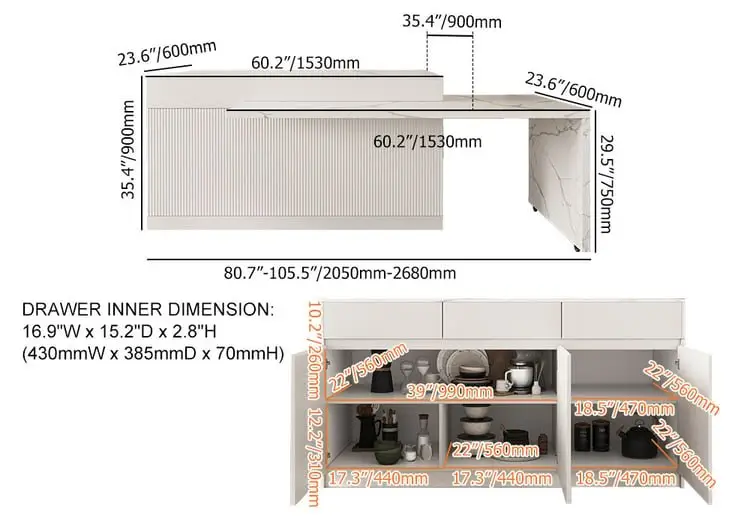 • Dynamic Extendable Design: Adjust the size from 81” to a massive 106” to create more workspace instantly — perfect for meal preps, hosting, and lavish spreads.