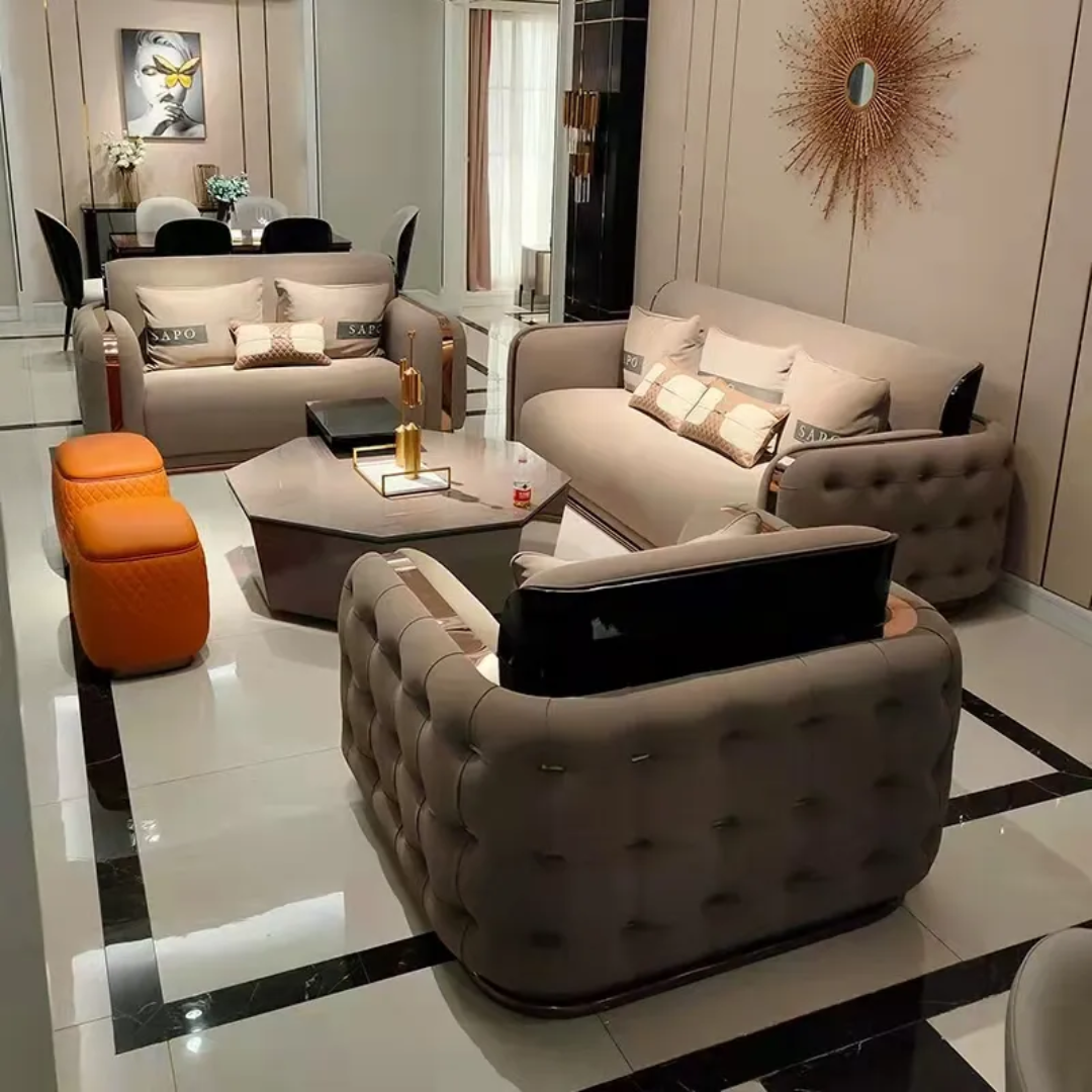 Crafted with precision, the Noah Modern White Luxurious Velvet leather Sofa: Elegant 5-Seater Living Room Set encompasses an exquisite five-seater configuration, offering a versatile arrangement of three plus one plus one seats. This design ensures ample space for relaxation and socializing, making it ideal for family gatherings, entertaining guests, or simply indulging in a luxurious seating experience.