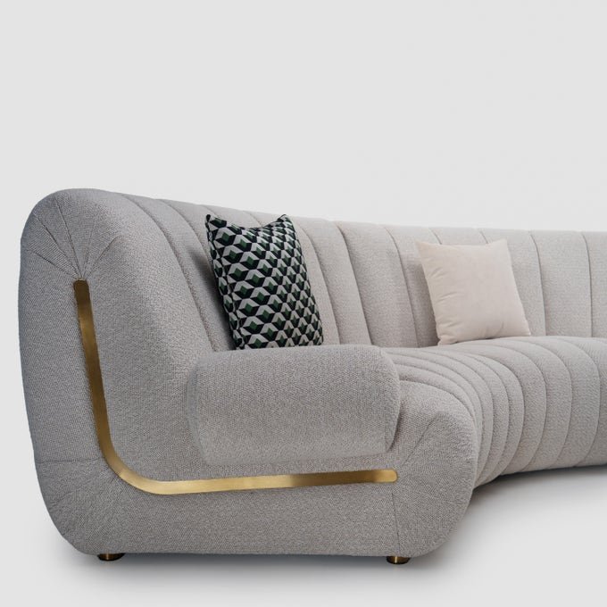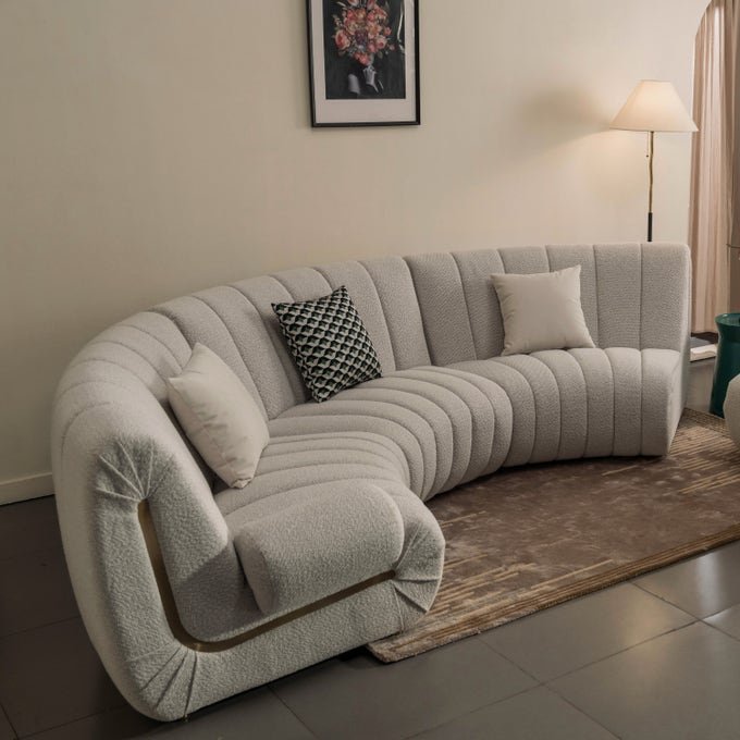 335cm Curved Design • True 5-Seater • Off-White with Gold Accents • Premium Polyester • Extra-Deep 107cm Comfort • Odour Resistant • Statement Sculpture