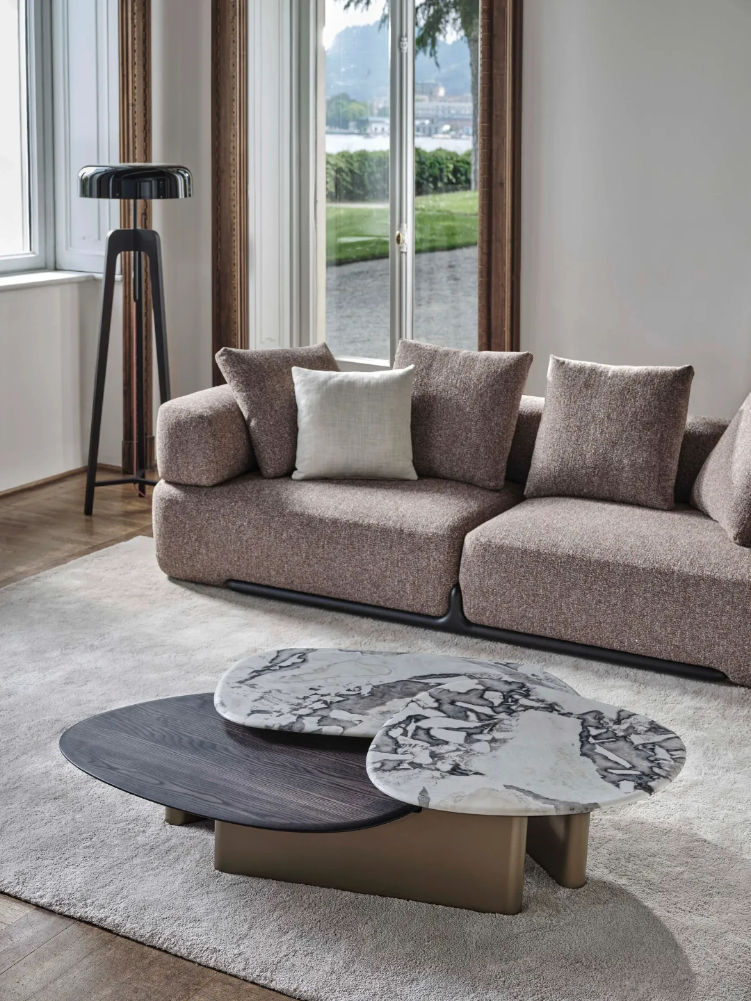 modern sintered stone coffee table, stainless steel coffee table, luxury end table, contemporary coffee table design, round stone top table, hourglass coffee table, designer center table, high-end home furniture, gold base coffee table, durable living room table