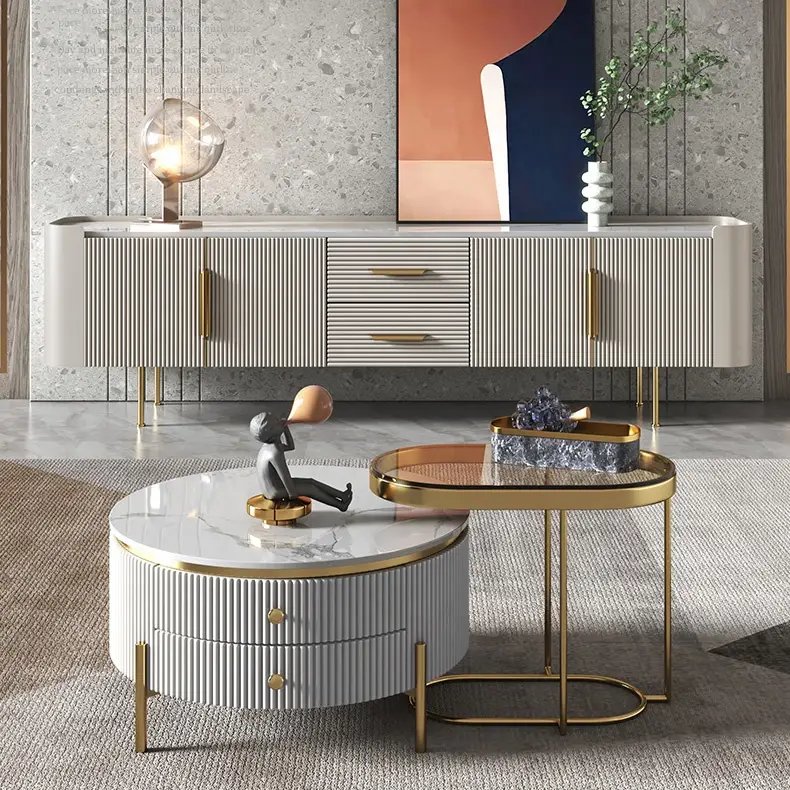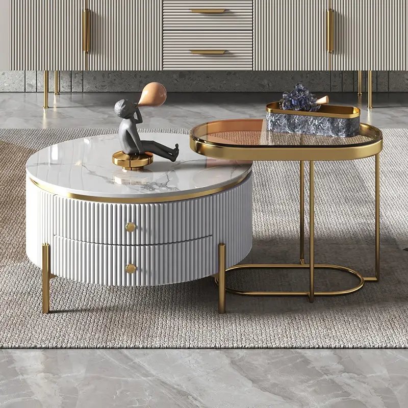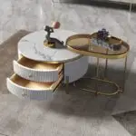 Practical and luxury, this coffee table set let you play with shape, texture, and color to round out any interior design. The airy metal base shines a warm glow over your space, while a gold finish completes the look. Style and substance strike a perfect balance in this nordic style coffee table set, don’t hesitate to bring this it to upgrade your living room.A light coffee table, a small side table, adorn your home. Product Dimensions: 80L x 80W x 35H cm, smaller table 45L x 30W x 45H cm