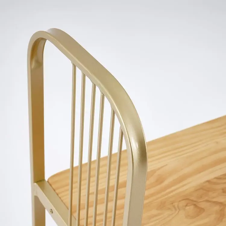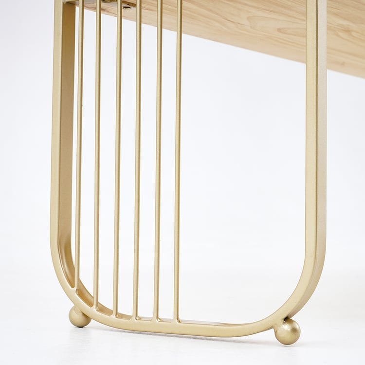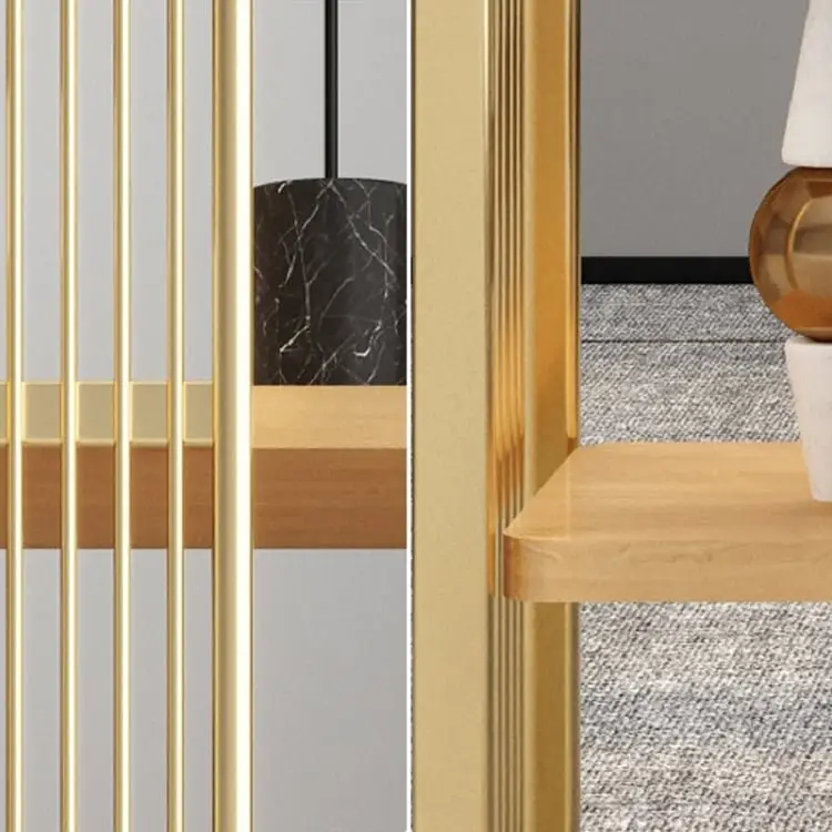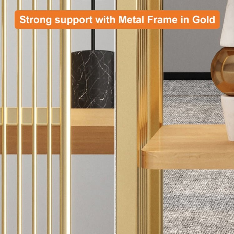 Vertical gold-finished stainless steel bars serve as both structural elements and design accents. The frame provide: