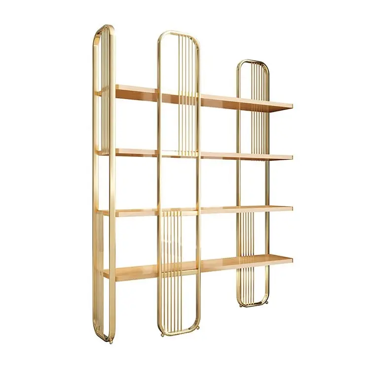 This display system transforms wall space into curated gallery. At 180 centimeters tall, the vertical composition creates architectural presence—open shelving framed in high-gloss finish with gold stainless steel accents. Natural wood shelves provide warmth; metallic details add contemporary luxury.