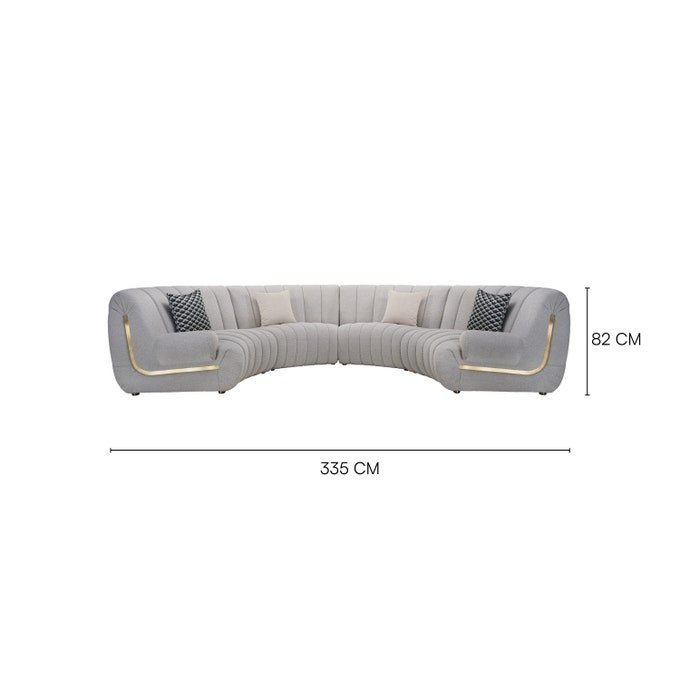 335cm Curved Design • True 5-Seater • Off-White with Gold Accents • Premium Polyester • Extra-Deep 107cm Comfort • Odour Resistant • Statement Sculpture