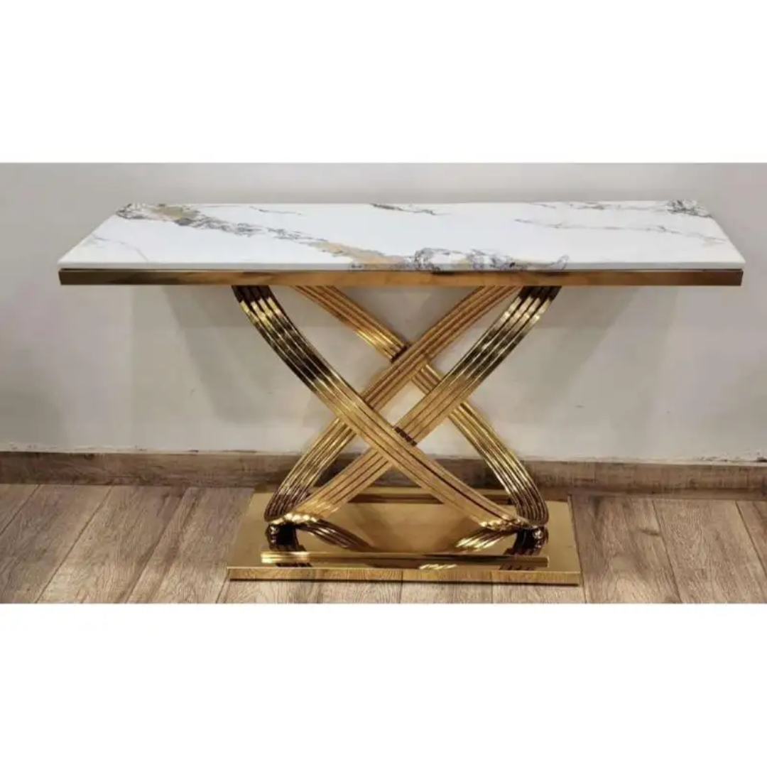 Simple yet tasteful, this modern console table will bring any space up to date. The smooth tabletop offers a spot for your framed family photos, potted plants, and artful accents. Crafted from durable metal in a gold finish, it features an openwork design and clean-lined look that’s perfect for your home. A great option for rounding out any space with an on-trend touch. Material: Natural Stone + Marble Veneer (top), Metal(frame) Finish: Gold Overall Assembly Required: No Care & Clean: Wipe Clean With Damp Cloth, Wipe Dry With Clean Cloth.