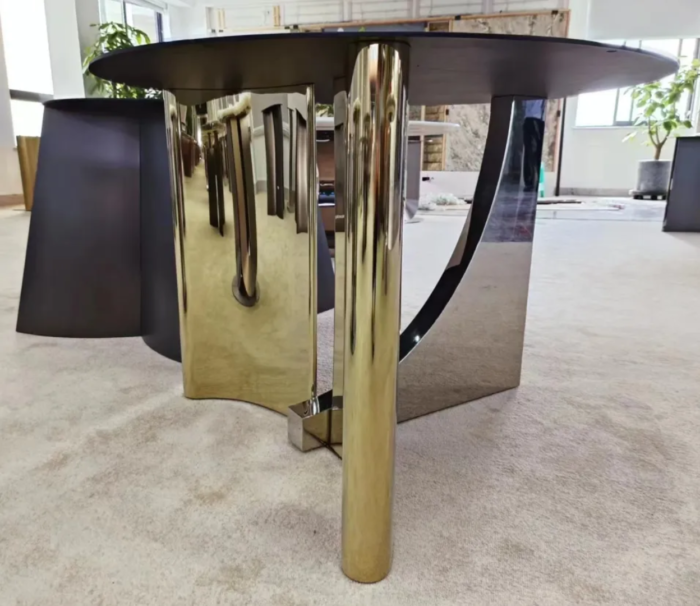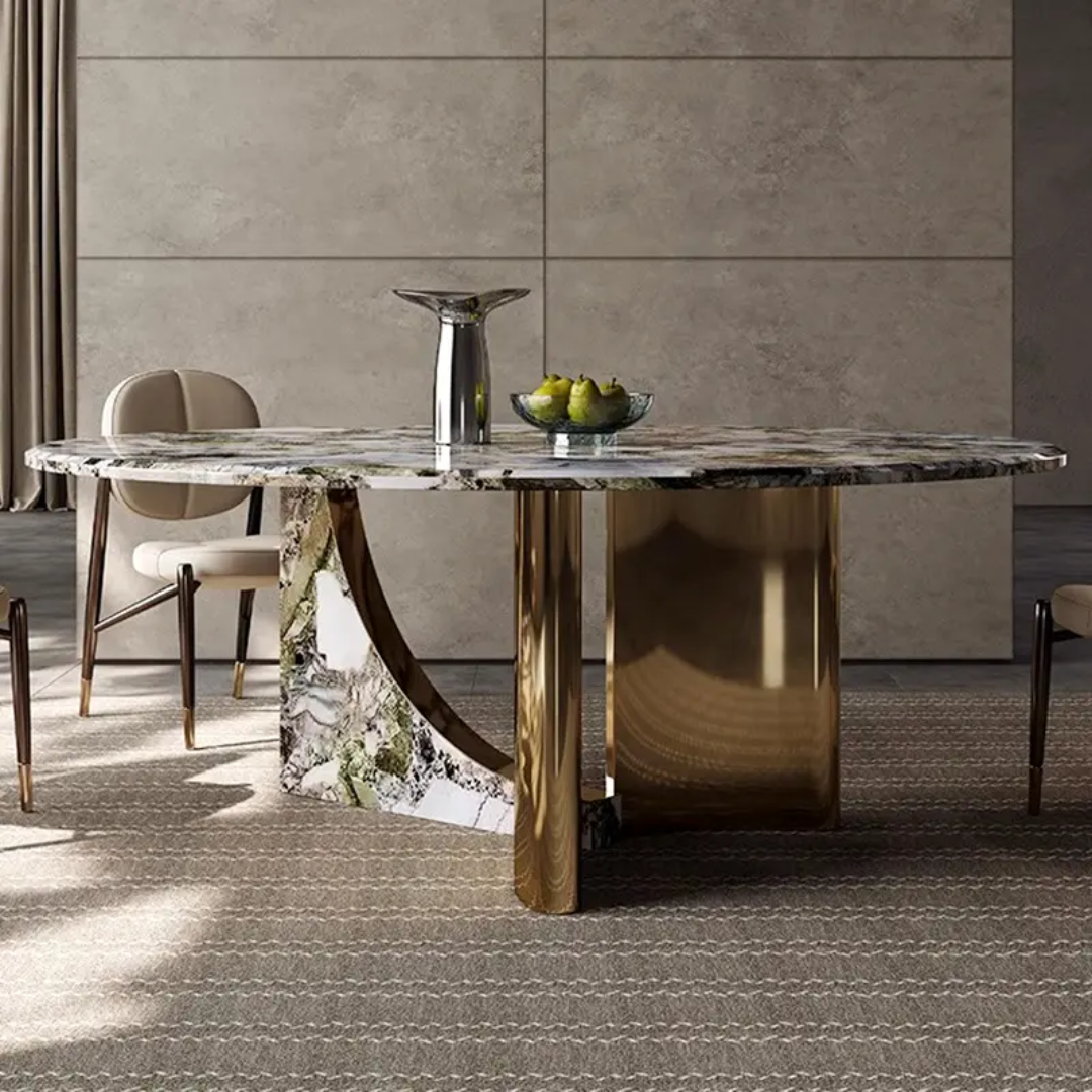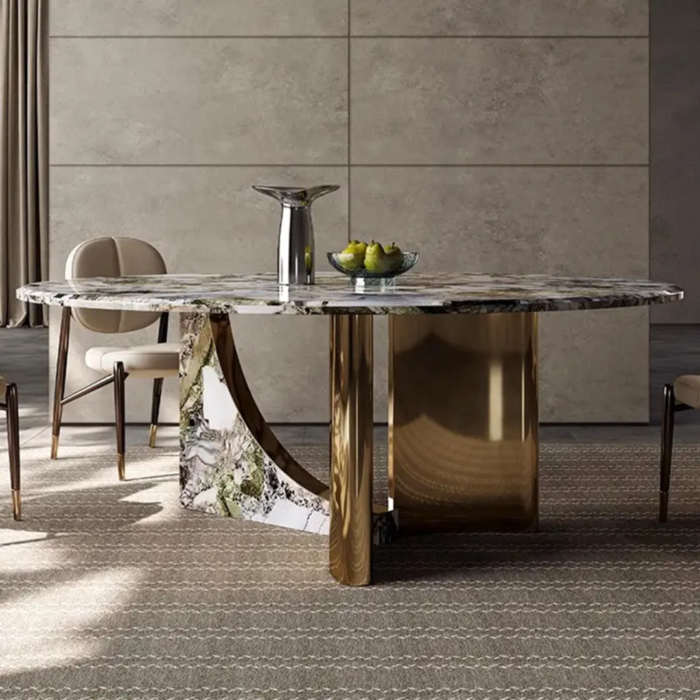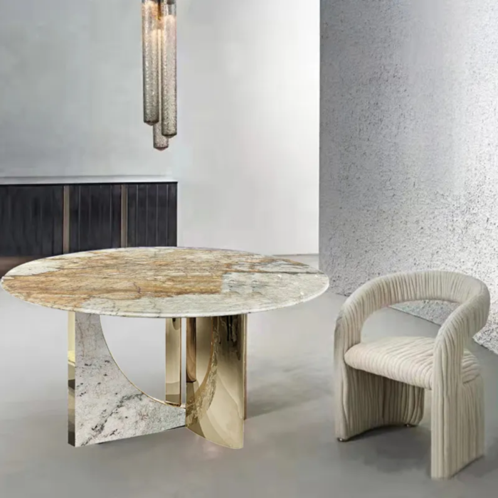 Elissa Dining Table Stainless Steel Golden Leg + Natural Marble Top Table with 6 chairs set ₹190,700.00 ₹176,520.00 Exclusive of taxes.