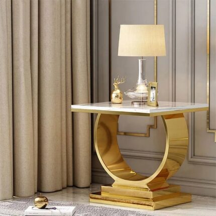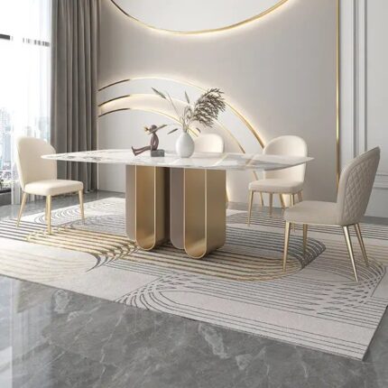 ₹94,260.00 Exclusive of taxes.Chelsea Dining Table Stainless Steel Golden Leg + Natural Marble Top Table