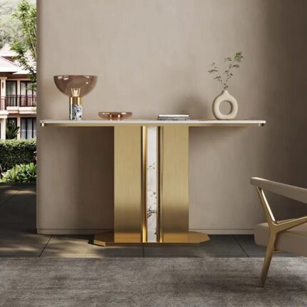 ₹28,999.00 Exclusive of taxes.Sodexo Console Table Modern Maximalist Design Gold Finish Marble Top Console Table